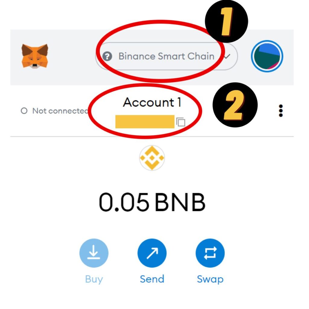 ก่อนที่จะเริ่มทำการโอนเงิน เพื่อนๆต้องเช็คให้แน่ใจก่อนว่า metamask ของเรานั้นรองรับเครื่อข่ายของ binance smart chain (bsc) ก่อน จากนั้นทำการคัดลอก Account Address